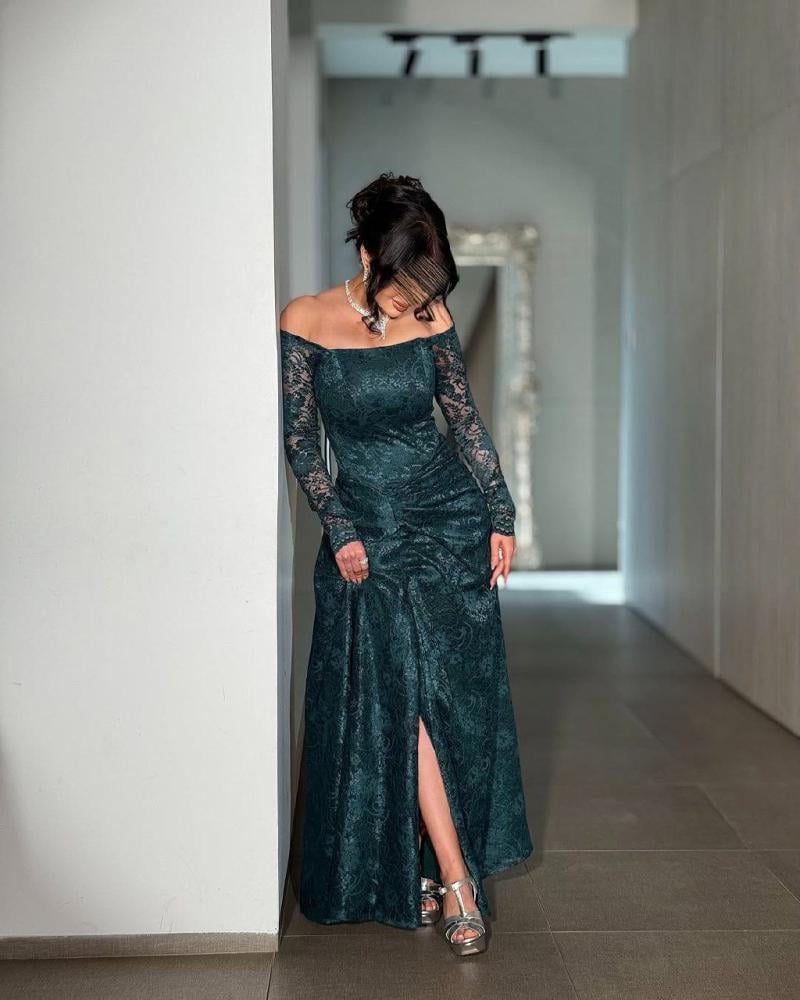 فستان دانتيل زيتي درجه اولى بفتحه ساق واكتاف مكشوفه