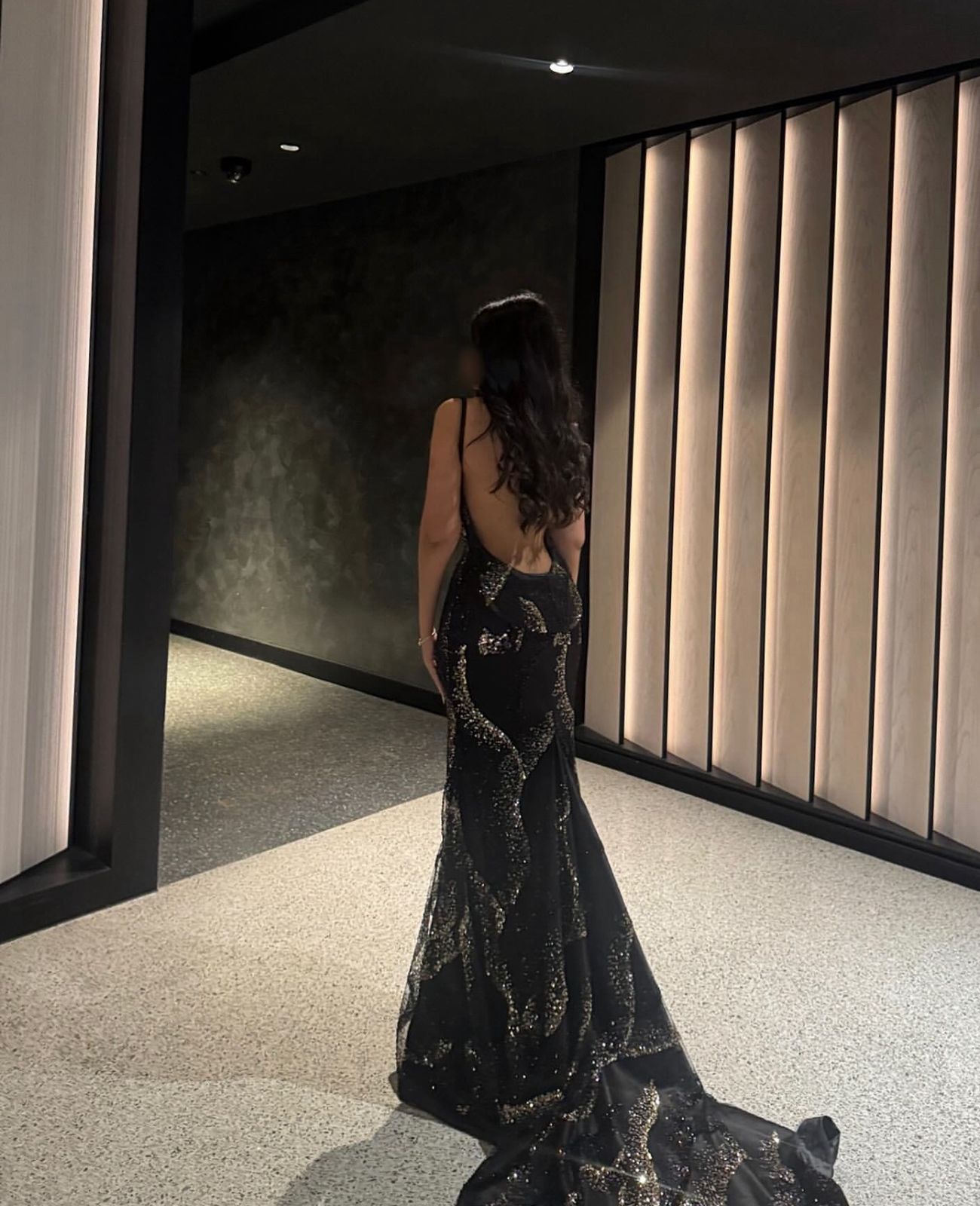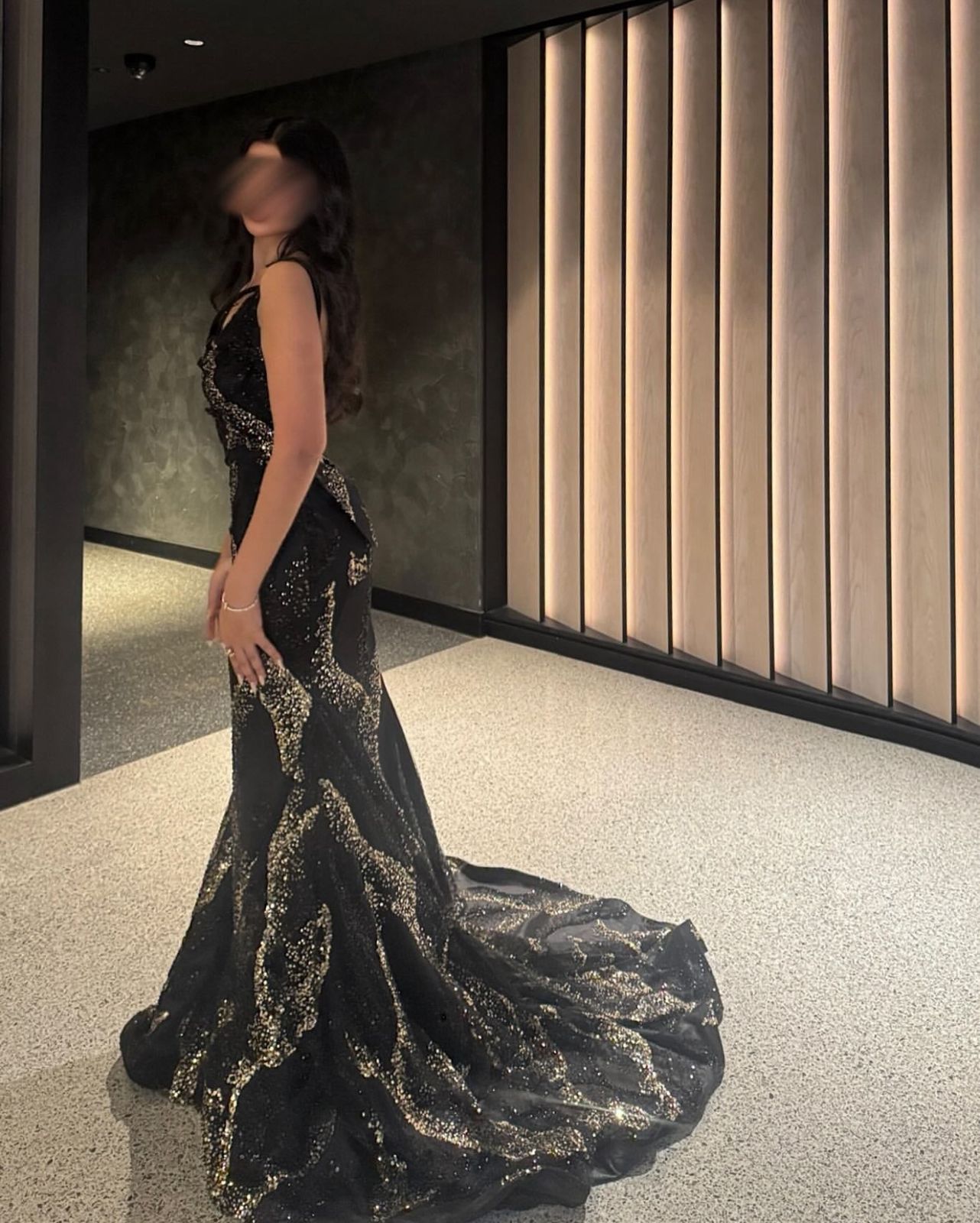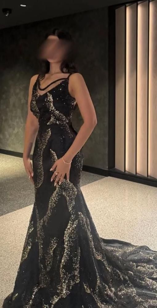 فستان سهرة مموج بتطريز بذهبي بذيل طويل